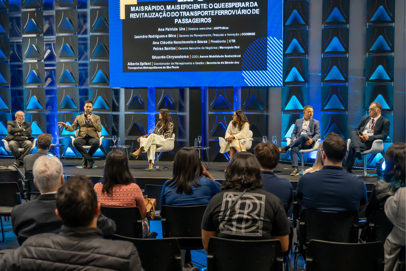 Eduardo Chrysostomo, diretor operacional da Aerom, participou do painel “O que esperar da revitalização do transporte ferroviário?”, realizado no primeiro dia do evento. O debate foi mediado por Ana Patrizia Gonçalves Lira, diretora-executiva da ANPTrilhos, e contou com a participação de Ana Cláudia Nascimento e Sousa (CTB), Leandro Rodrigues e Silva (CODEMGE), Petras Amaral (Marcopolo) e Alberto Epifani (STM). Durante o painel, Eduardo compartilhou a visão da Aerom sobre inovação, sustentabilidade e os caminhos possíveis para o fortalecimento do transporte ferroviário no Brasil.