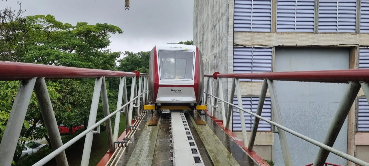 O veículo destinado ao Sistema MagLev-Cobra, fabricado pela Aerom, chegou às instalações da Universidade Federal do Rio de Janeiro (UFRJ) e foi cuidadosamente içado na via elevada, onde será submetido a integração, testes e instalação do sistema de automação.