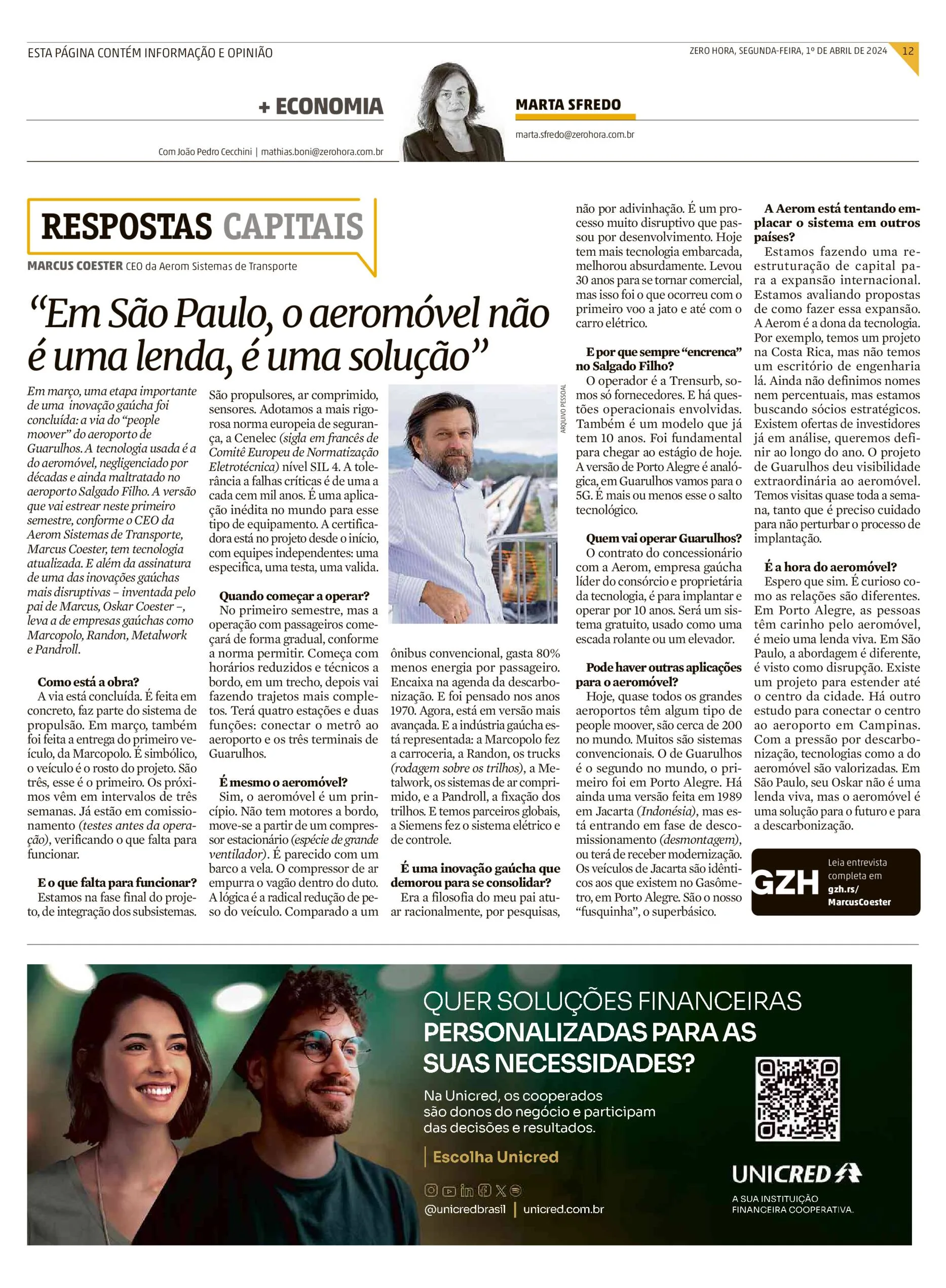 Confira a entrevista que CEO da Aerom, Marcus Coester, concedeu ao Jornal Zero Hora em 31 de março.