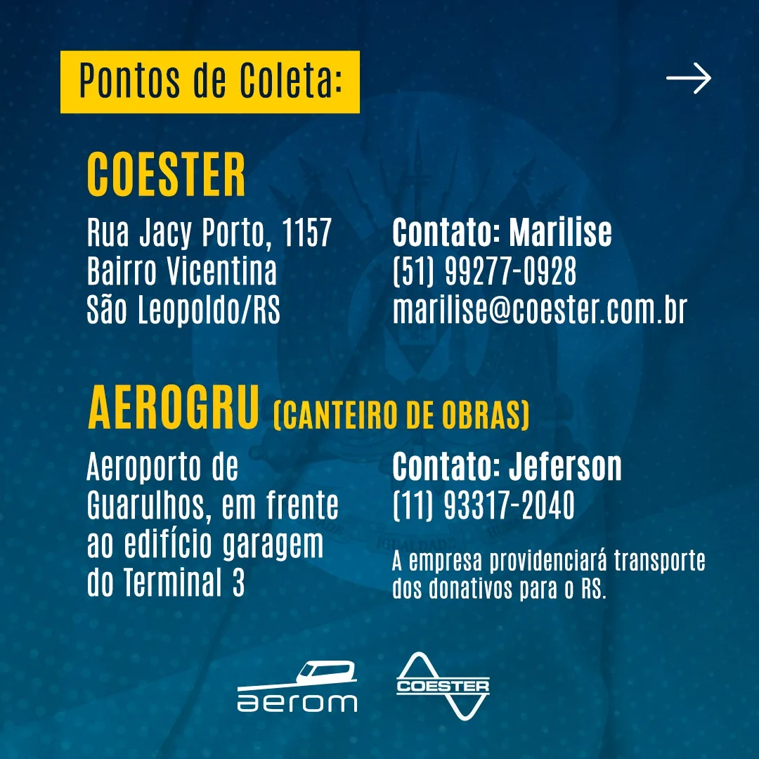 Para aqueles que desejarem apoiar os funcionários do Grupo Coester que perderam suas casas, disponibilizamos a chave PIX e pontos de coleta em São Leopoldo/RS e no Aeroporto de Guarulhos em Guarulhos/SP.